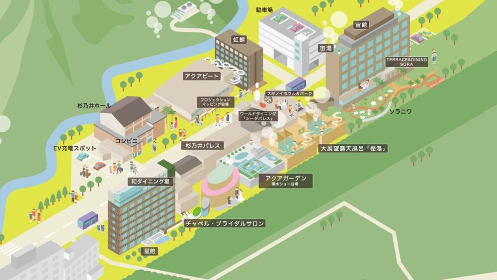 | 宿泊棟 | 棚湯 | 宙湯 | アクアビート | アクアガーデン | エンタメ施設 | 駐車場 |