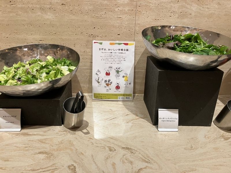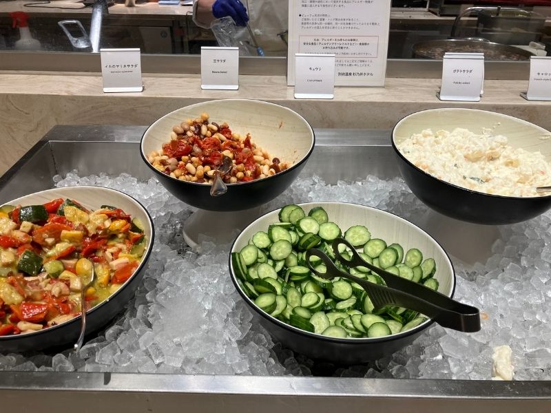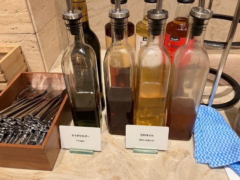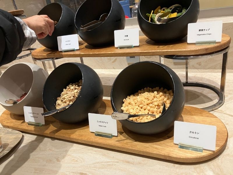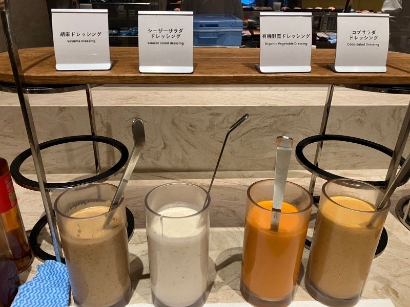 サラダコーナーではドレッシングやトッピングを選んで自分好みのサラダが作れるよ
