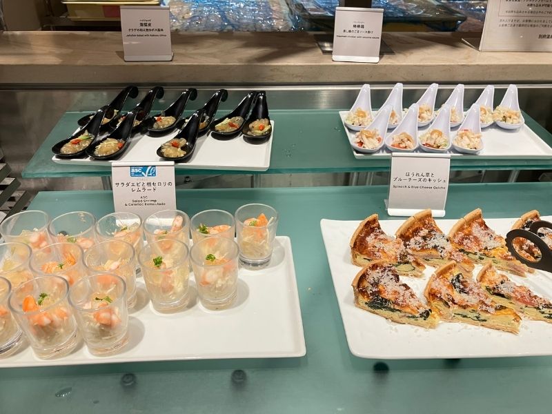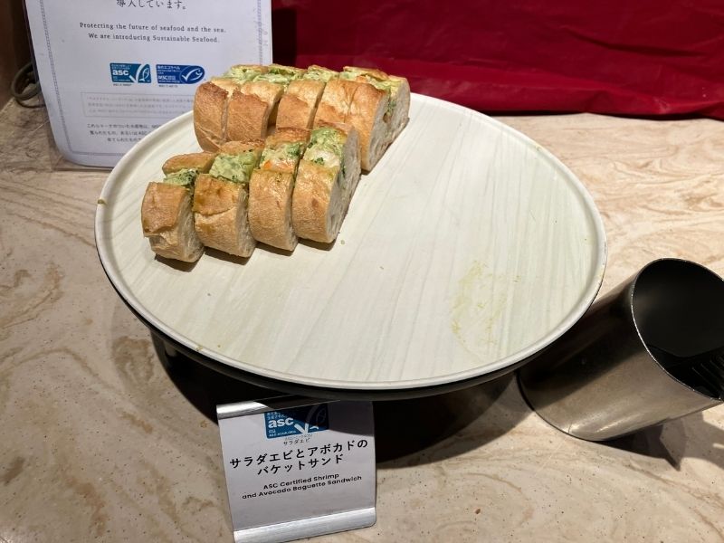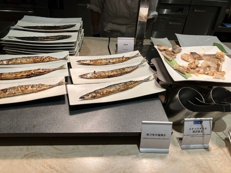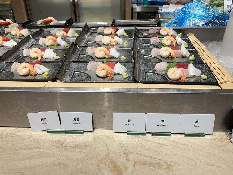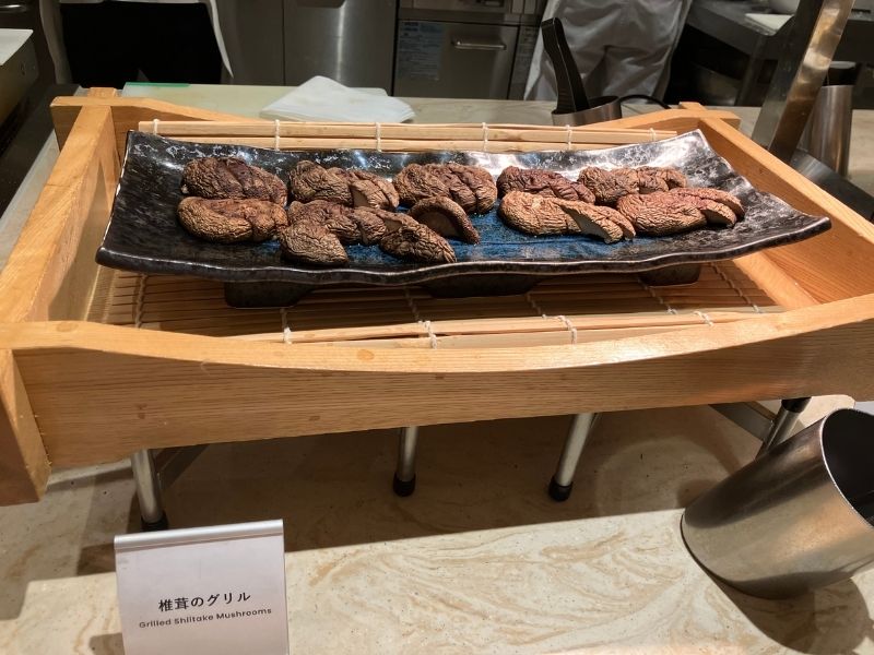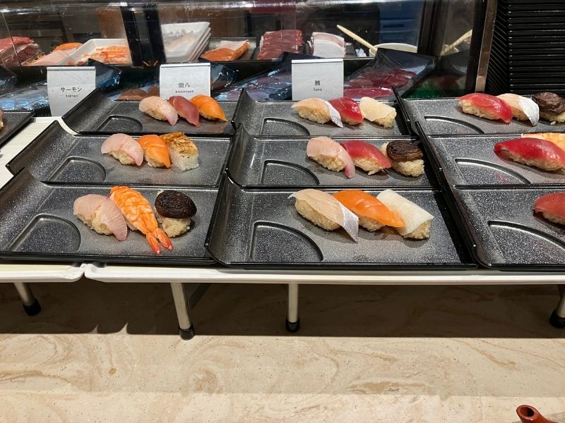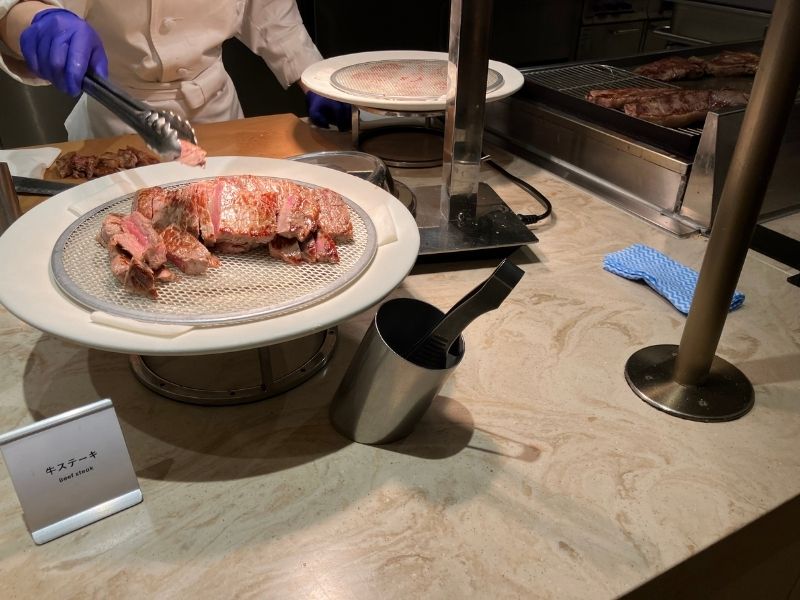 ハンバーグ、ステーキ、ローストチキン、お寿司、お刺身など、肉、魚料理も充実。シェフが目の前で調理するライブキッチン形式なので、お寿司やお刺身は希望のネタで注文することもできます。